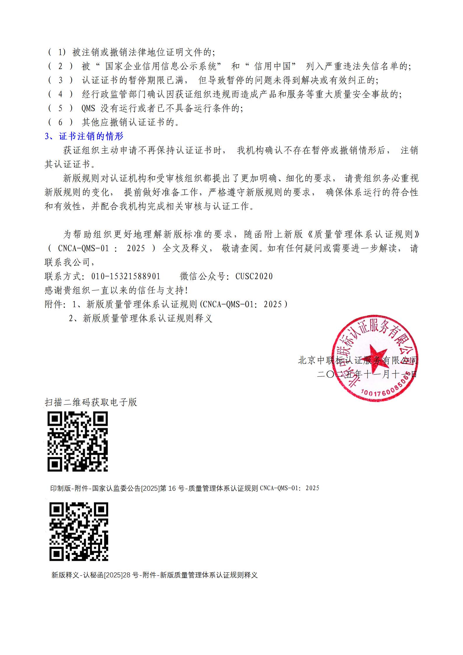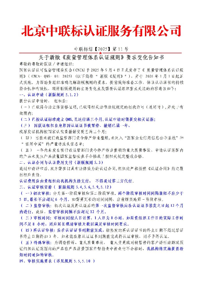 关于国家认监委新版《质量管理体系认证规则》要求变化的告客户书