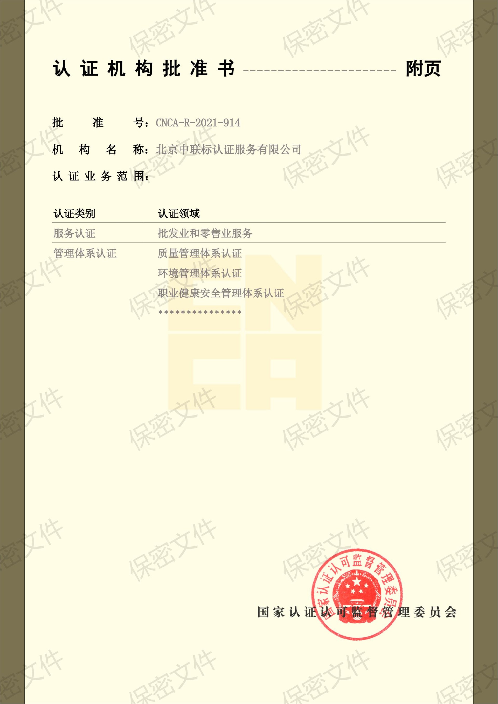 英文名称:Beijing China Union Standard Certification Service Co.,LTD.),简称:中联标认证(CUSC),统一社会信用代码91110302MA01Y2HQXA 批准号CNCA-R-2021-914。